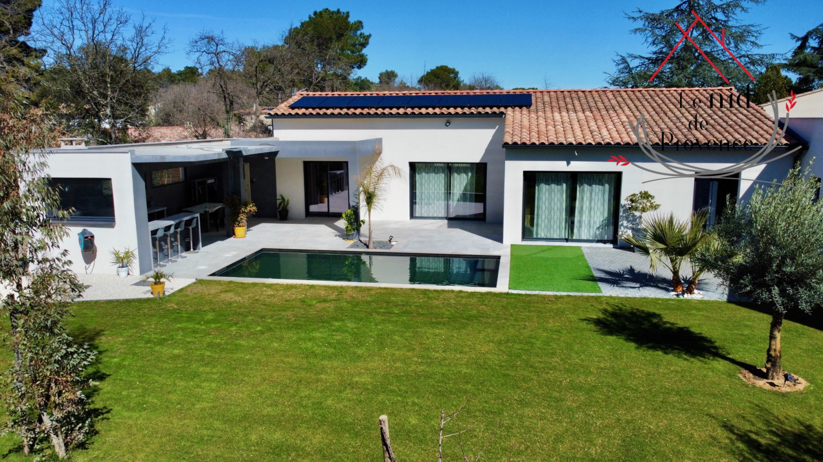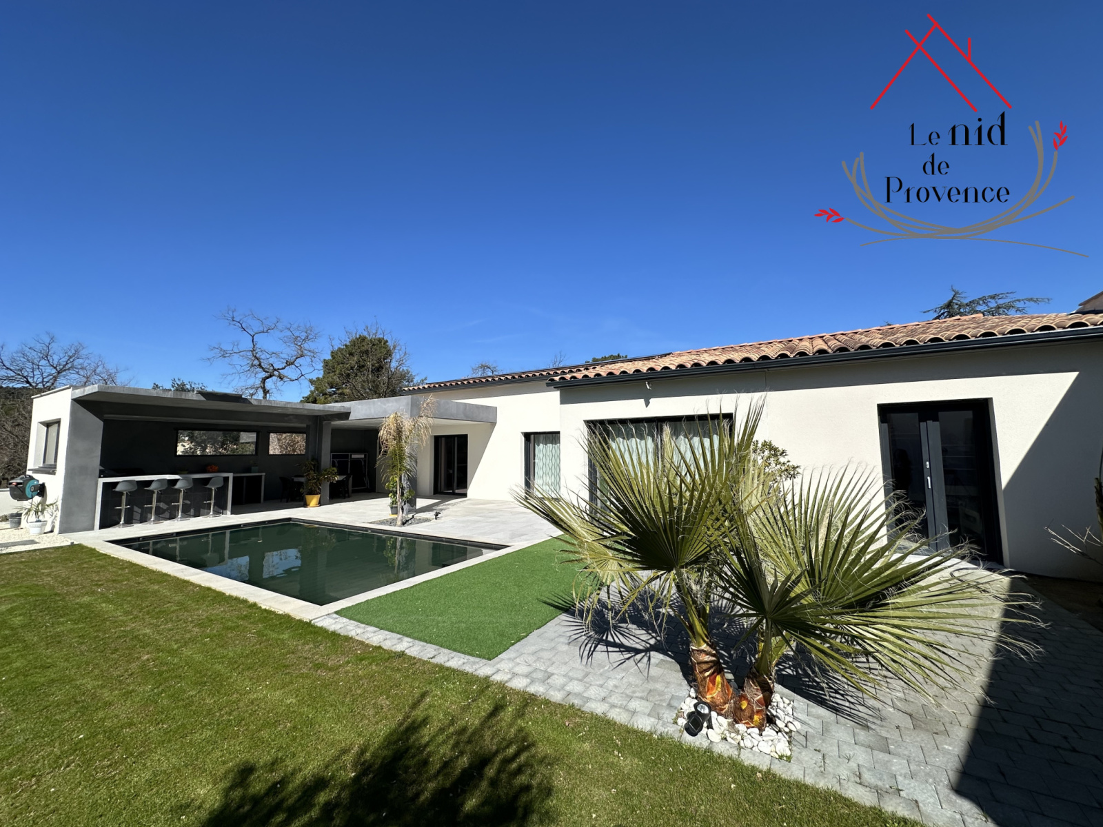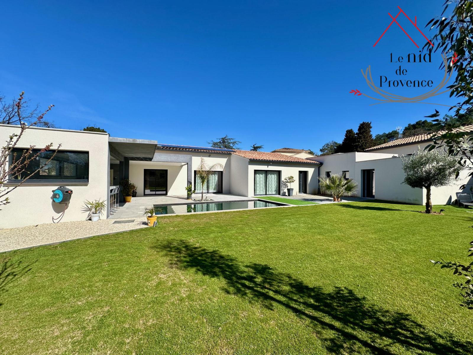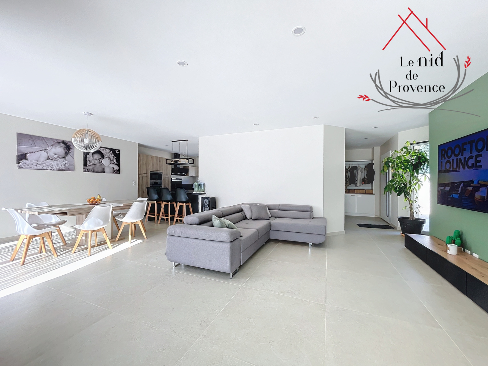 Le Nid de Provence présente à la vente une magnifique villa moderne de plain-pied d'environ 170m² érigée en 2018 sur un terrain de plus de 1000m², nichée sur les hauteurs de Mornas, dans un cadre privilégié. Cette résidence allie une architecture contemporaine à des matériaux de haute qualité.